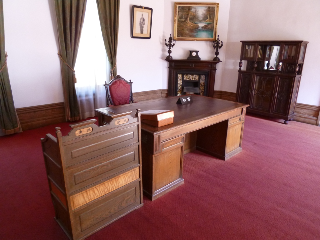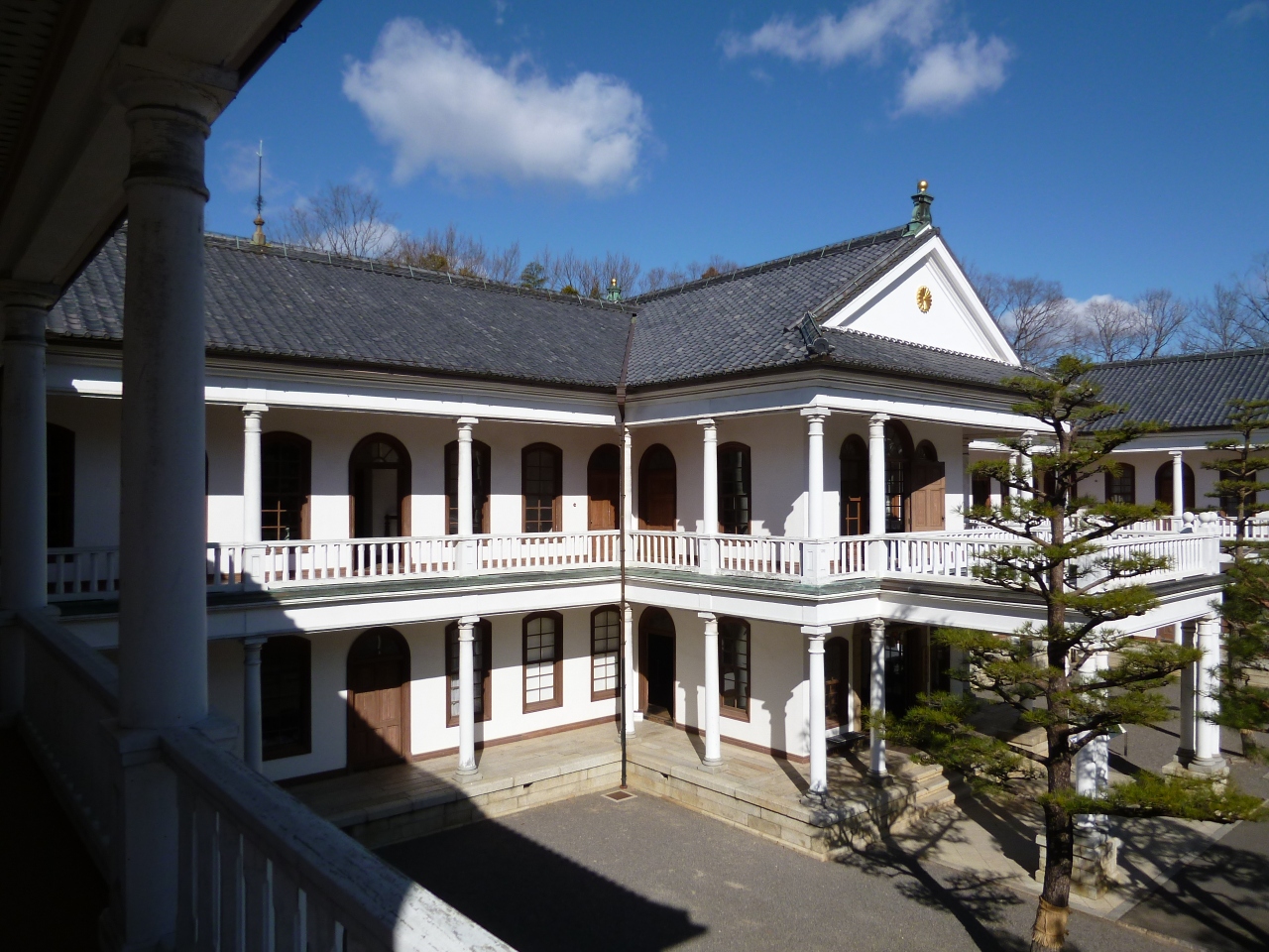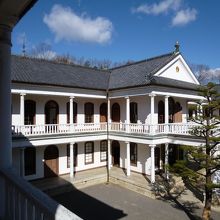 明治村の正門を入って左の石段を降りた所にあり、村内にある建物の中でも内部展示も含め最も充実している一つでしょう。左右対称な構造やアーチ、円柱などは洋風建築に則り、屋根は日本建築を踏襲しています。明治12年に竣工した点と相まって明治政府の行政機構が着々と地方都市まで浸透していった時代を彷彿とさせる様々な展示があり、見ごたえがあります。