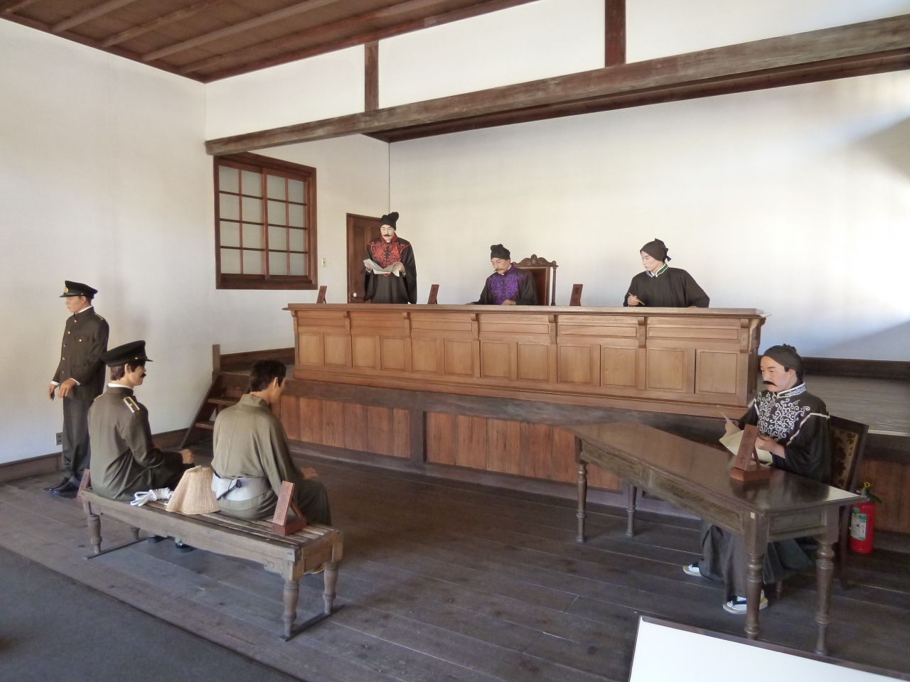 立法、行政、司法の三権の分立が司法権という概念とともに成立した明治期の頃の建築です。ロウ人形とともに当時の裁判の様子が再現されています。建物は和風の日本建築の伝統に則って建てられており、その中に刑事法廷が開設されている点など興味深いですね。