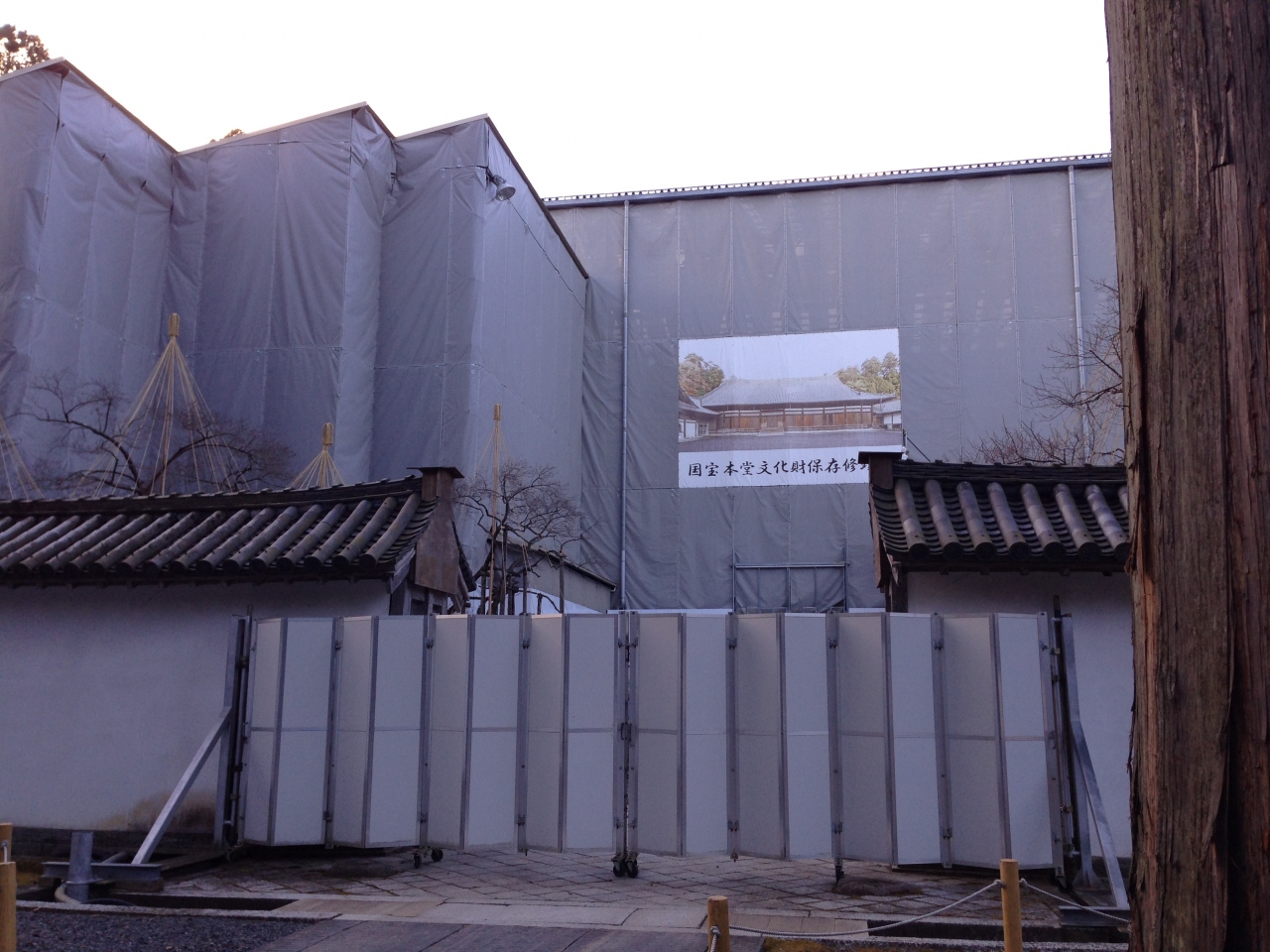 入口から続く参道は松に囲まれ厳かな雰囲気。 冒頭で触れていますが、本来拝観入口から見えている本堂は灰色の覆いに囲まれていて何も見る事が出来ません。 この修理期間は平成28年春頃まで続く予定とのことです。