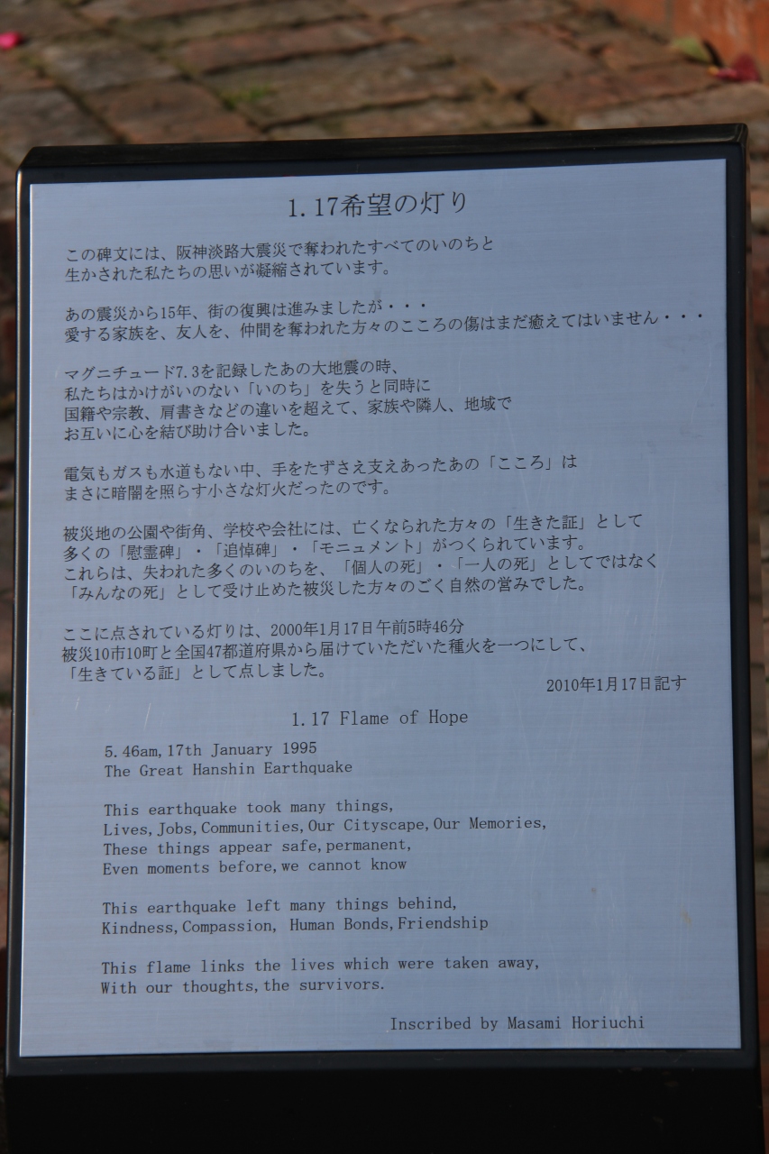 希望の灯りは、阪神淡路大震災の犠牲となった人々の鎮魂と慰霊と大きなダメージを受けた神戸の復興と再生を願って2000年1月17日にメモリアルモニュメントとして東遊園地で灯されたそうです。
