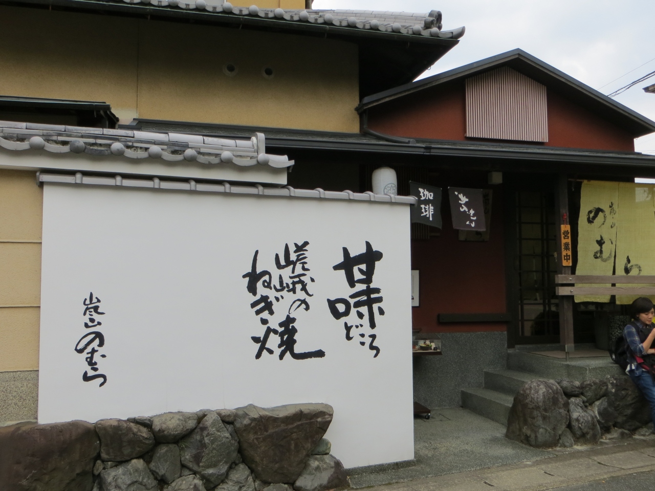 渡月橋から北へ嵯峨野の散策へ向かいます。その途中、渡月橋から数分歩いた右側(東)に路地があってその突き当りに嵐山のむらがあります。メインストリートから京都らしいのれんを掛けた入口が見えます。中へ入るととてもシンプルで清潔感があり、よく手入れされたお庭が見渡せます。ここの名物はねぎ焼き。九条ねぎやこんにゃくなどいろいろ入っていて甘いタレがよく合っていて美味でした。