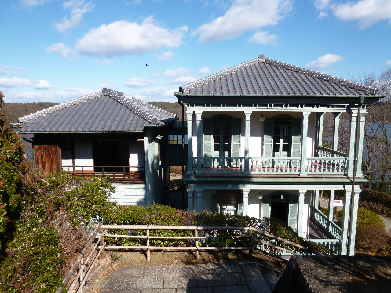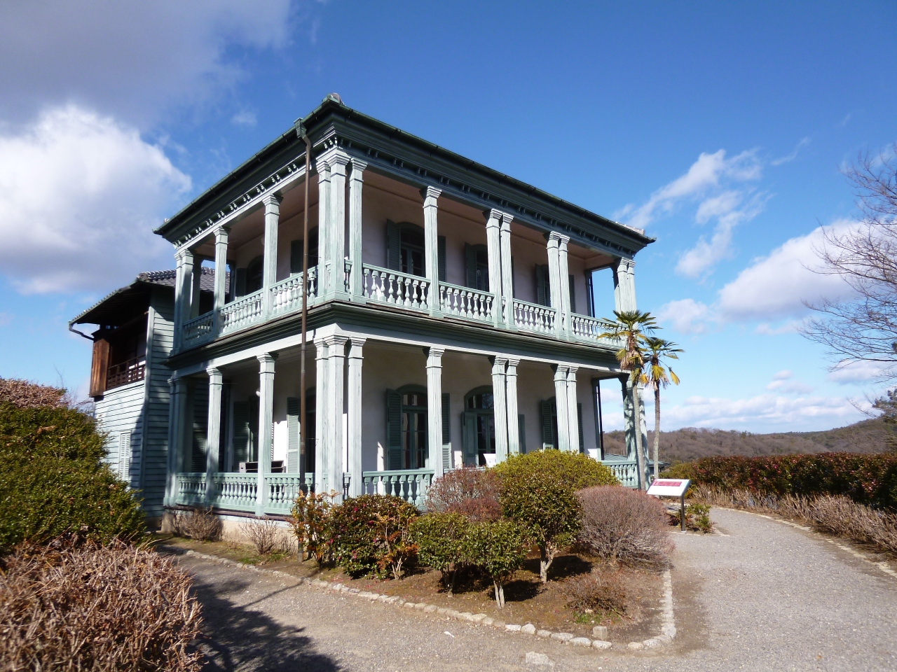 明治20年に貿易港神戸に建てられた西洋人住居ということで、アーチ状のエントランスや窓の開口部、ベランダなど西洋のテイストに満ちています。面白いことに渡り廊下でつながった離れがあり、そこの2階に和室が設けられています。