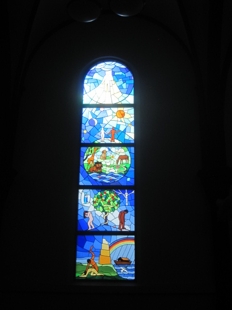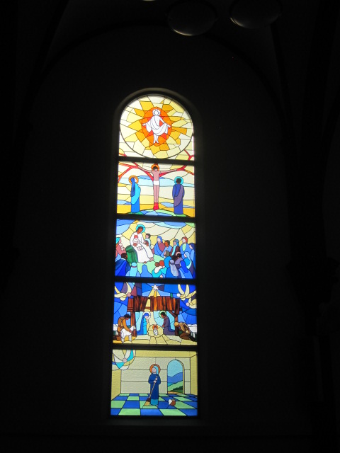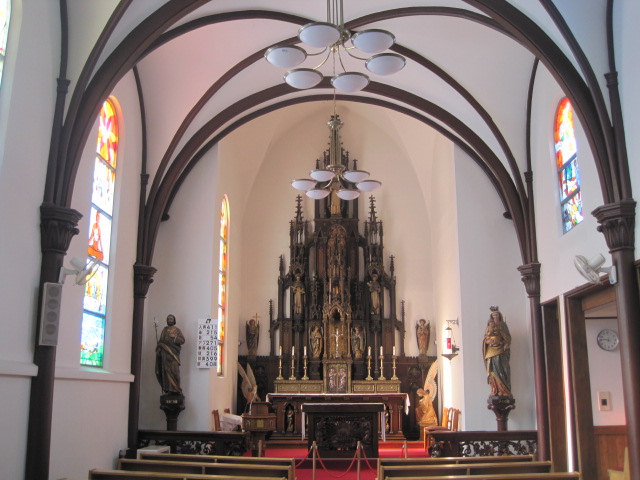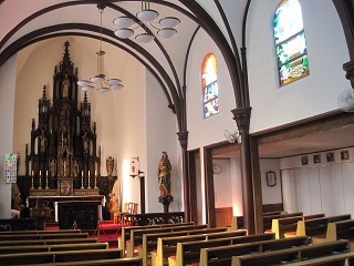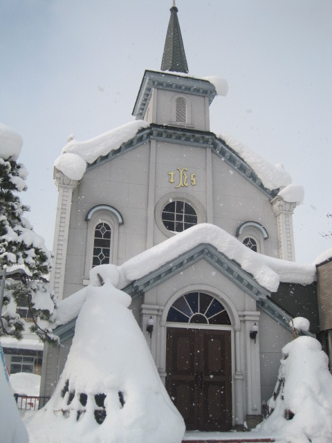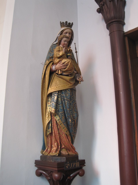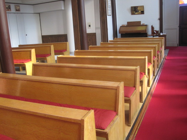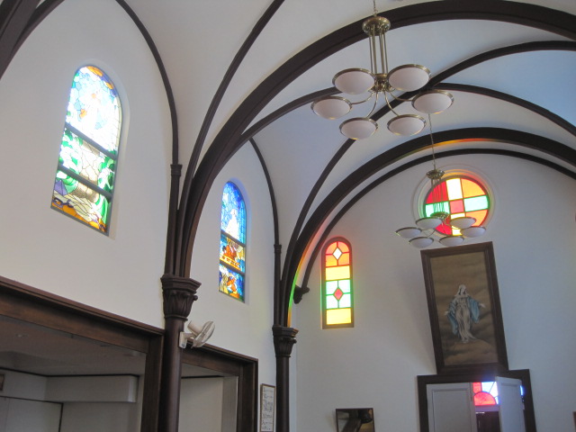弘前の街歩きで訪れた弘前カトリック教会でした。ミサ以外の日は見学できます。扉を開けて、最初に目に飛び込んできたのが立派な祭壇でした。窓のステンドグラスは、人をかたどったものもありました。椅子の足元には、畳が敷いてありました。