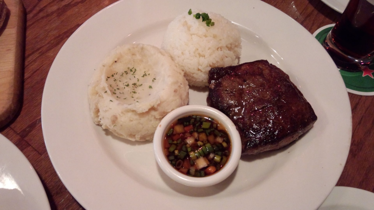 新しく出来た幕張新都心イオンへ行った際にお昼を食べに行きました。流石にお正月3日のイオンは激混み、何処も既に列を作ってみんな待っているし、期待も出来ないので幕張駅前の「アウトバックステーキハウス」へ。メニューを見てビックリ!どれもこれもボリューム感たっぷり。お薦めのブルーミンオニオンには流石に手が出ず、ベーコンバーガーと200gのステーキで精一杯。オーストラリア感一杯なのに、オリジナルはアメリカのお店とか、今度は大食い若者と行きたいです!
