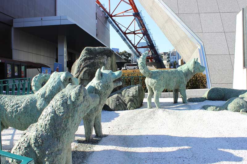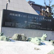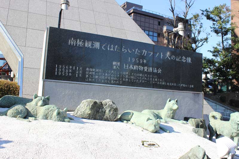東京タワーの基部にあります。東京タワーが完成した1958年に、南極観測隊で働いた樺太犬が現地に置きざれにされ、一年後にタローとジローが生還しましたが、日本動物愛護協会は二度とそうした事件が起きて欲しくないという思いで、動物愛護をンボルとして開業したばかりの東京タワーに記念像を造りましたが、今ではされを見る人もあまりいません。