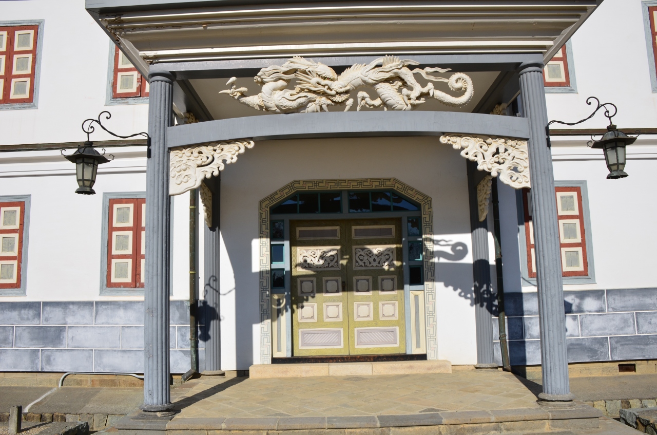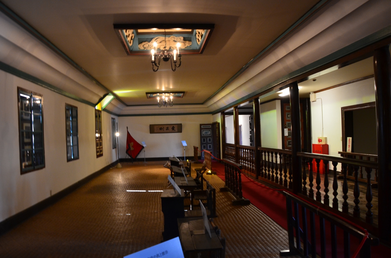 日本の伝統的な建築技法をベースにして、和風テイストの中に洋風エッセンスと取り入れた建物で、中央に東西南北の漢字の表示された塔屋を乗せたシンメトリーな外観の中央部には龍や天使が舞っている彫刻があったりしてかなり不思議な雰囲気を醸し出しています。