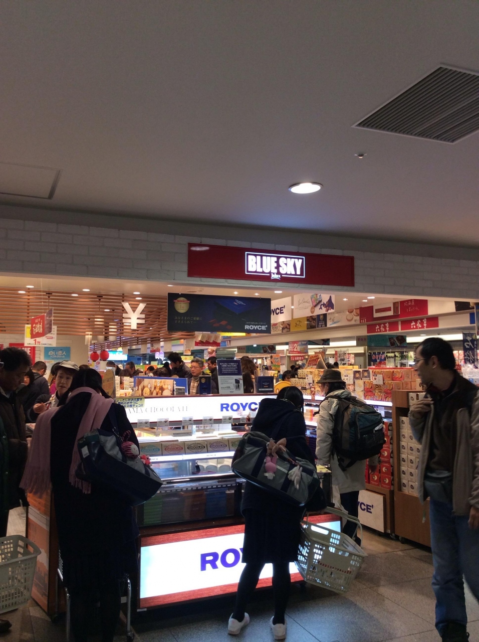 ブルースカイは、日本航空系のショップです。JALカードで、1000円以上の買い物の場合、5パーセントの割引になりますが、1部はなりません。また、花畑の商品などが買えません。カウンターが近いので、荷物を預けるのに便利なお店。