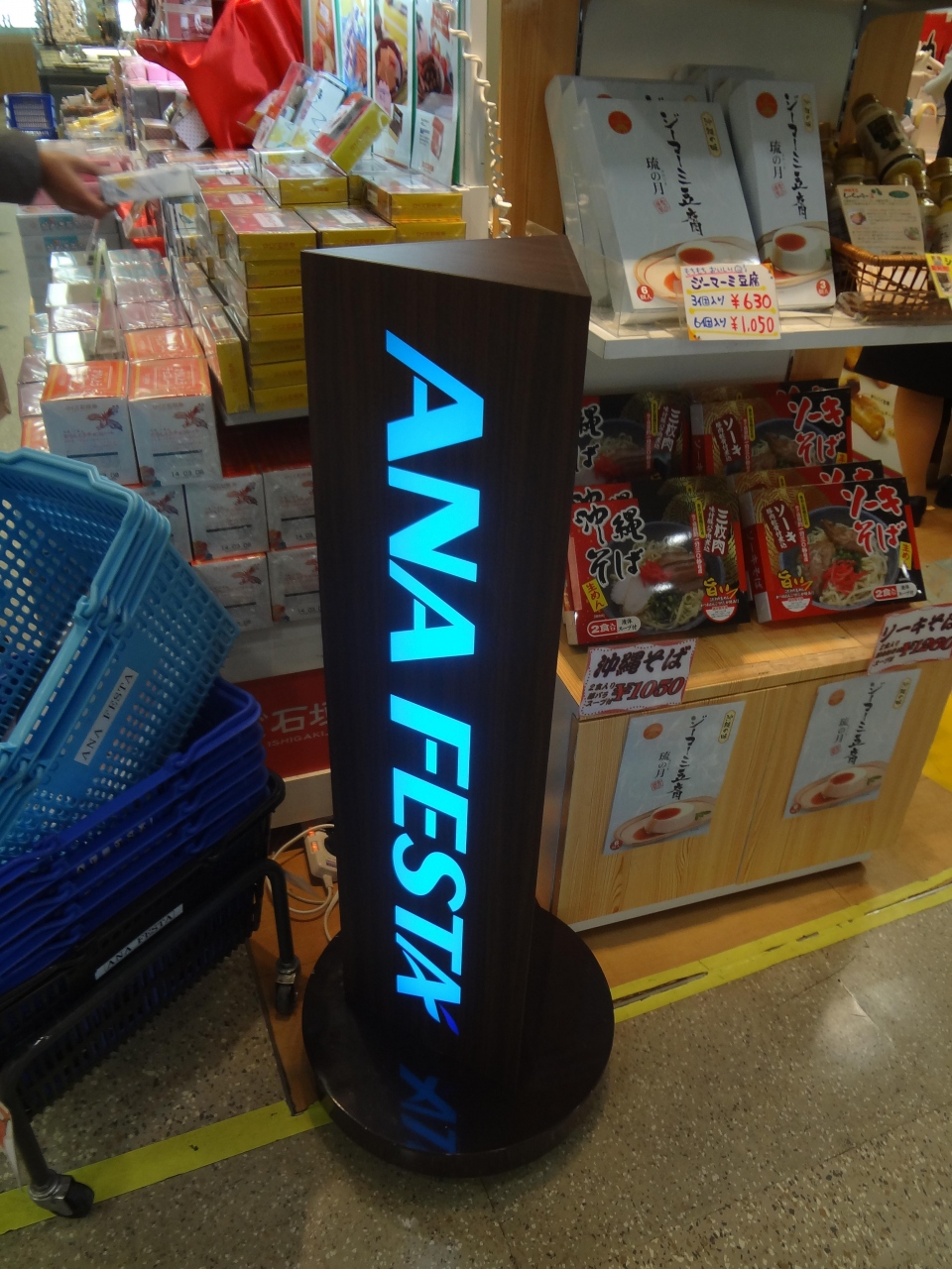 ANA側にあるお土産やです。広い店舗内には沖縄名物のお菓子や加工品、沖縄そばなど様々なものを多種に渡って取り扱っているので、大概のお土産はここで済んでしまいます。試食があったり、店員さんも親切だし、たくさんいるし、何かと便利でした。