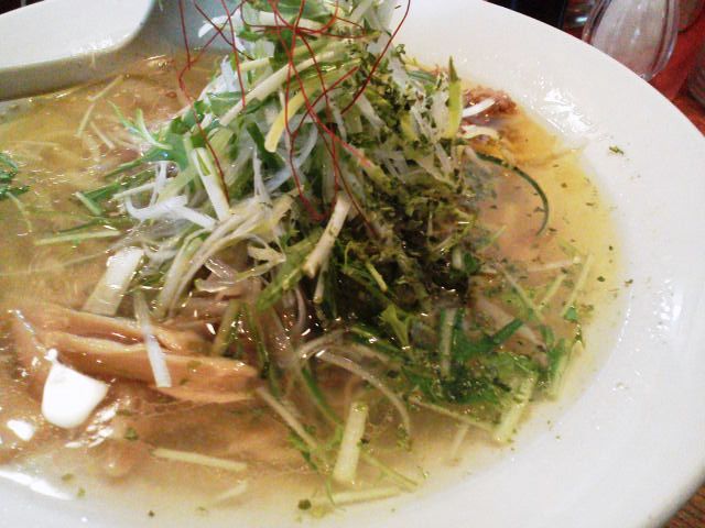 鶏の優しい味とネギの千切り、水菜、笹がき牛蒡が抜群の味を引き出している。