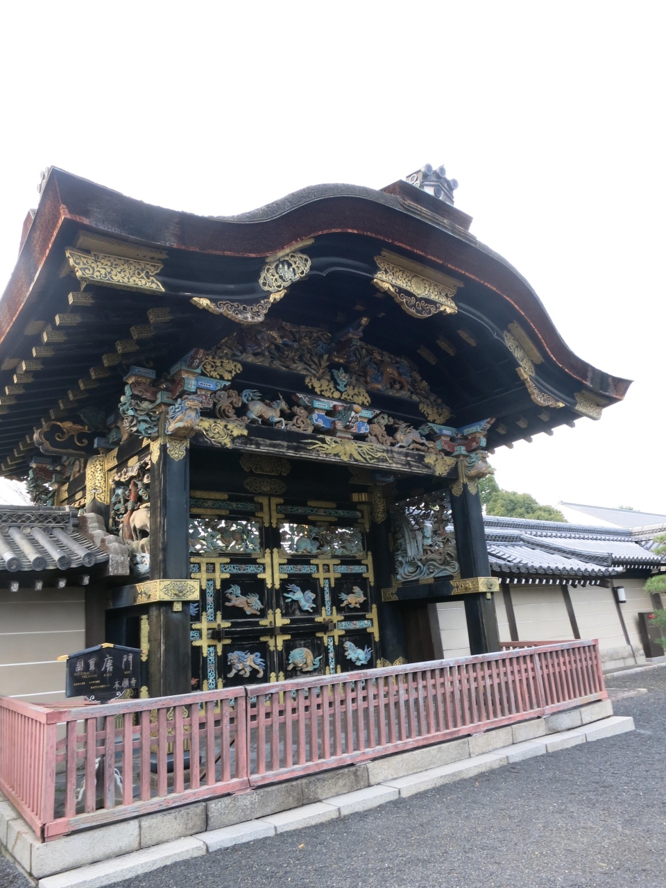 京都 西本願寺には飛雲閣や書院等たくさんの国宝に指定されている建造物がありますが、ほとんどが非公開になっており自由に見ることができません。唯一公開されているのが北小路通りに面した唐門です。牡丹に唐獅子、竹に虎、麒麟に孔雀の彫刻、極彩色に施された唐門は日光の陽明門のようです。御影堂の左奥側にあって見に行かない人も多いですが、観なきゃ損です。