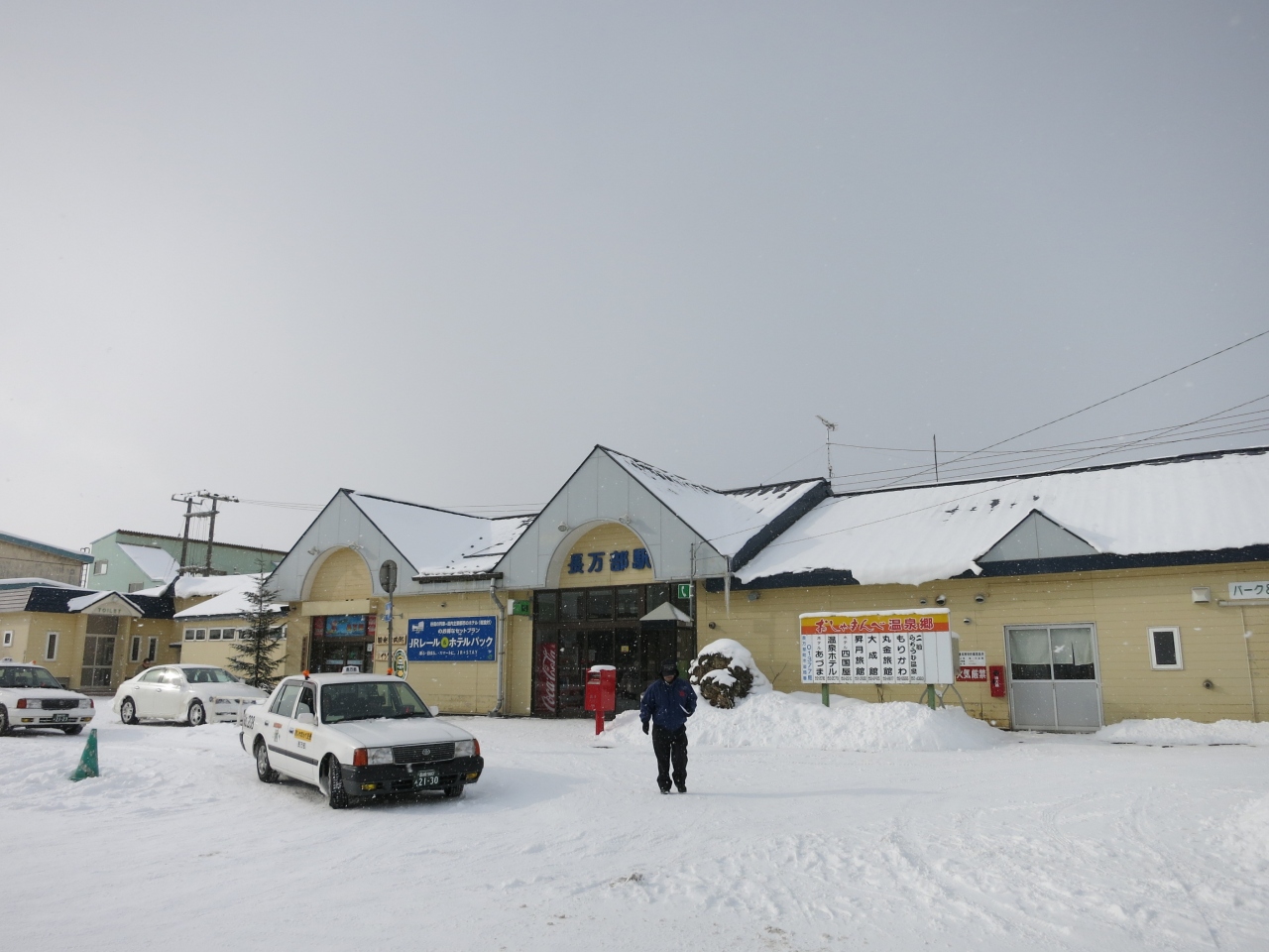 駅の裏手には長万部温泉もあり、少しさびれていますが、旅館が軒をつらねています。駅前からタクシーや送迎を利用するか、500mほど離れた(函館本線と室蘭本線が分かれるあたり)歩行者専用の跨線橋を利用すると徒歩で行けます。また、10km以上離れた二股ラジウム温泉もこの駅からの送迎となるようです。