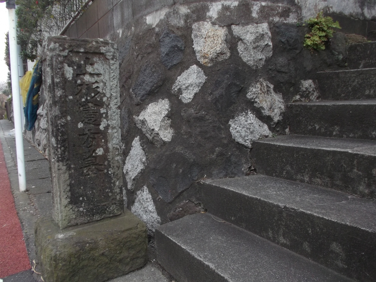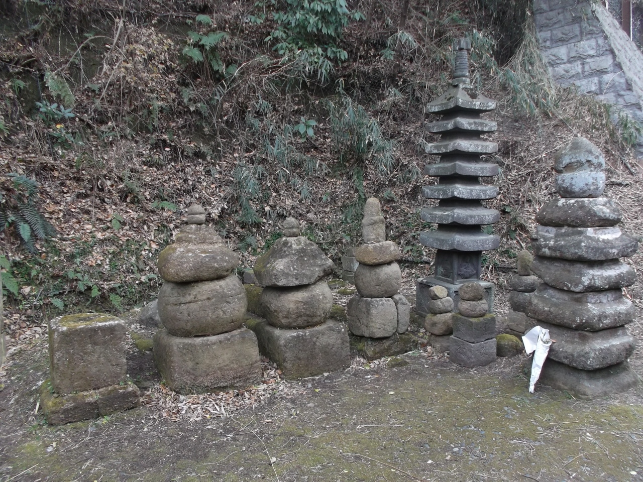 極楽寺駅から成就院に向かうカーブしたところ、白いアパート前の路傍に古い石標が、よく読めませんがこれが目印。半間程の小路に入り突き当たりまで進むと左手に空地があります(アパート裏)。なにやら古めいた解説版があり苔むした感の石塔が並んでいます。三つの石が積まれたような石塔、5層、七層の石塔があります。