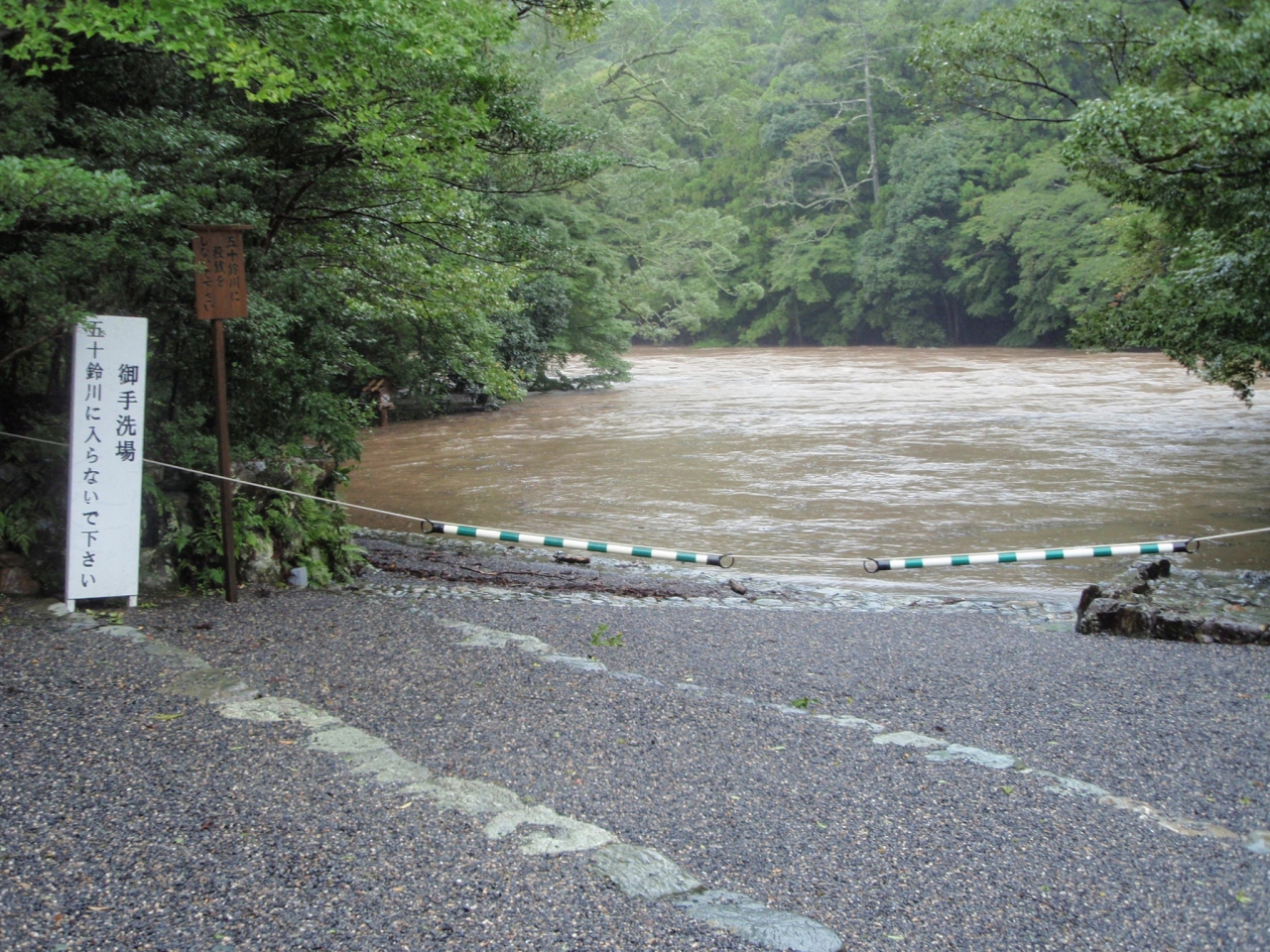 現地では相当雨が降ったようで、内宮近くの五十鈴川が増水しており、川のそばまで近づくことができませんでした。