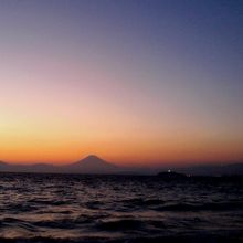 正面に富士山を望む海岸ですので、朝であれば雪の積もった富士山が、夕暮れ時であれば、富士山のシルエットを眺めることができます。