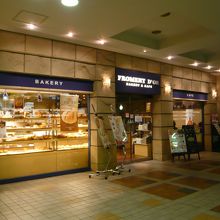 改札を入って目の前にあります。入って左手側にパンが並んだスペースがあり、右側はイートインのスペース。