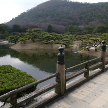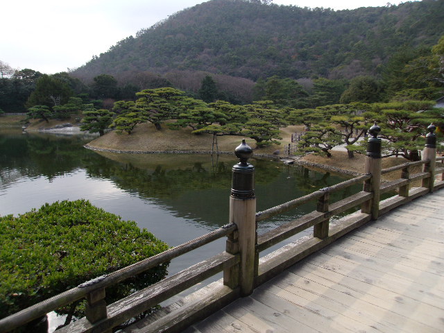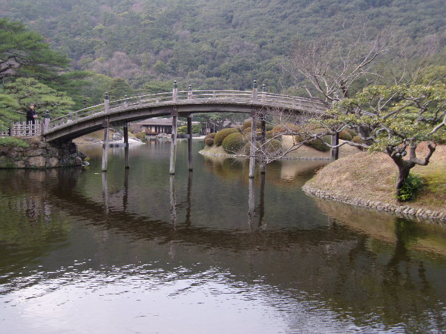 栗林公園内で一番大きな橋だそうです。南庭の一番南東側、南湖にかかる橋ですが、何よりも、飛来峰より掬月亭を眺めたときに手前に見える橋です。どこから見ても美しく、南庭のアクセントになっています。名前は弓張り月(半月)が湖面に影を映す姿からつけられたようです。この辺りは一番の撮影スポットということで、人がいっぱいでした。