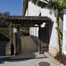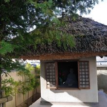 庭園築山には芭蕉庵を模した茅葺き屋根の祠があります。