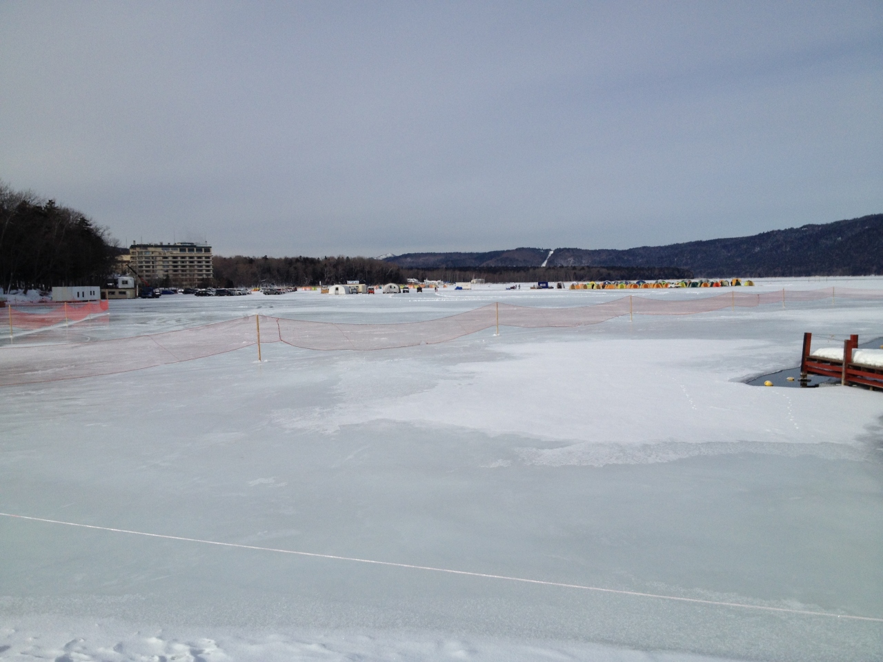 なので湖は全面凍っており、氷上にはワカサギ釣り用のテントが数多くありました。ワカサギ釣りのほかにも氷上を走れるバイクもありにぎわっていました。
