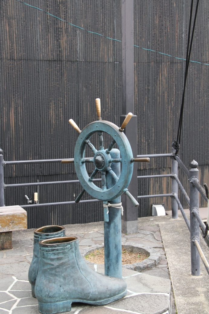 高台にあるため、景色が良いです。このブーツを履いて、船の舵を操縦している龍馬の気分を味わうことができるスグレモノです。龍馬になりきり記念写真を撮影することができました。なかなかレアな体験型の銅像です。ちなみに、この銅像は、大きめの作ってあるので、男性でも靴を履いたままブーツの中に足を入れることができますよ。