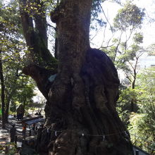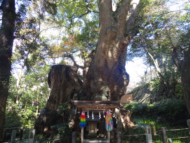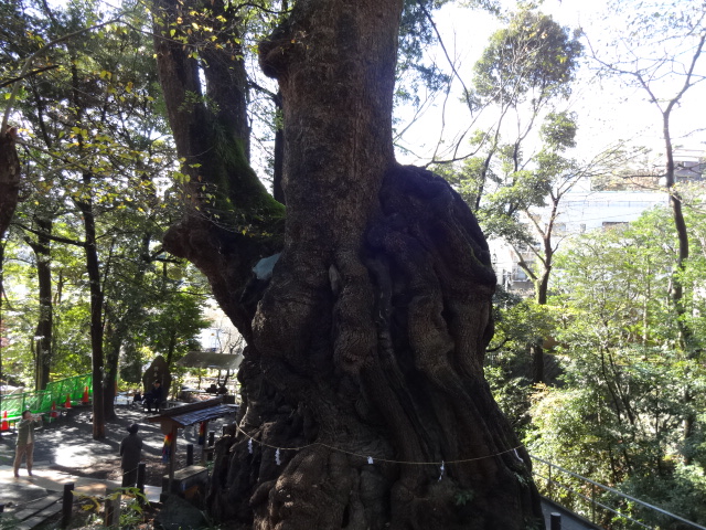 神社の左奥にある大楠の木は大変立派で圧巻です。幹の周りを1周すると、1年寿命が延びるとのことで、皆さんまわっていらっしゃいました。