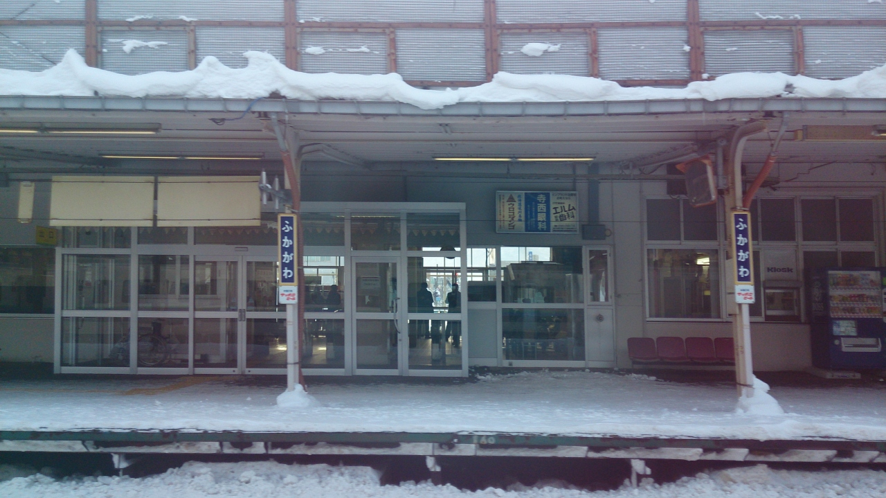 昔から変わらぬたたずまいの駅です。待合所には深川名物の「うろこだんご」もおいてあり、素朴な感じのする駅舎です。ここから深川の市街地にぬけます。街は昔、駅から広がっていたのですが最近は閉める店も増えてきています。これといった観光地も無い町ですが、米も野菜もおいしい町です。それにしても雪が多いな。