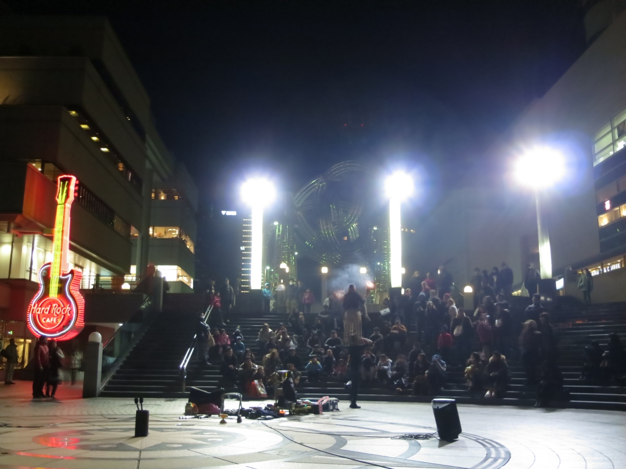 家族で横浜観光に行った際、ドックヤードガーデン広場で大道芸を見ていると、後ろにこのパブリックアートがあり、気になっていました。帰宅後、クチコミを見て、「モクモクワクワクヨコハマヨーヨー」というアートだということを知りました。ドックヤードガーデン広場の階段を上がったところ、グランモール公園前(ランドマークプラザとクイーンズスクエアの中間地点)にある、ステンレス製のこのアートは、夜でもものすごい存在感でした。「もくもく湧く雲」という形状のイメージに、高揚した気持ち「ワクワク」という言葉を掛け、さらに横浜の発展を願う「前途洋々」(ヨーヨー)という意味も込めて造られた、彫刻家の最上壽之さんの作品のようです。