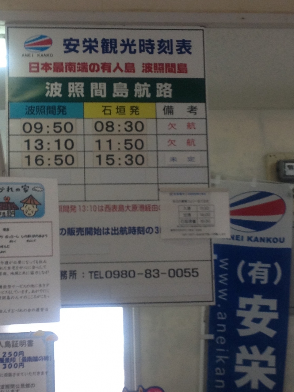 写真は12月10日火曜日のお昼頃、波照間港の安栄観光のカウンターに出ていたものです。3便運航は未定とありますが、フェリー出港時【14:00】には欠航になりました。