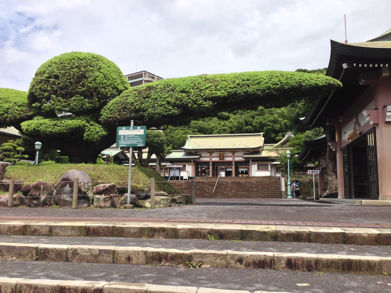 鳥居をくぐり進むと、鶴が翼を広げた植栽が待ち構えています。