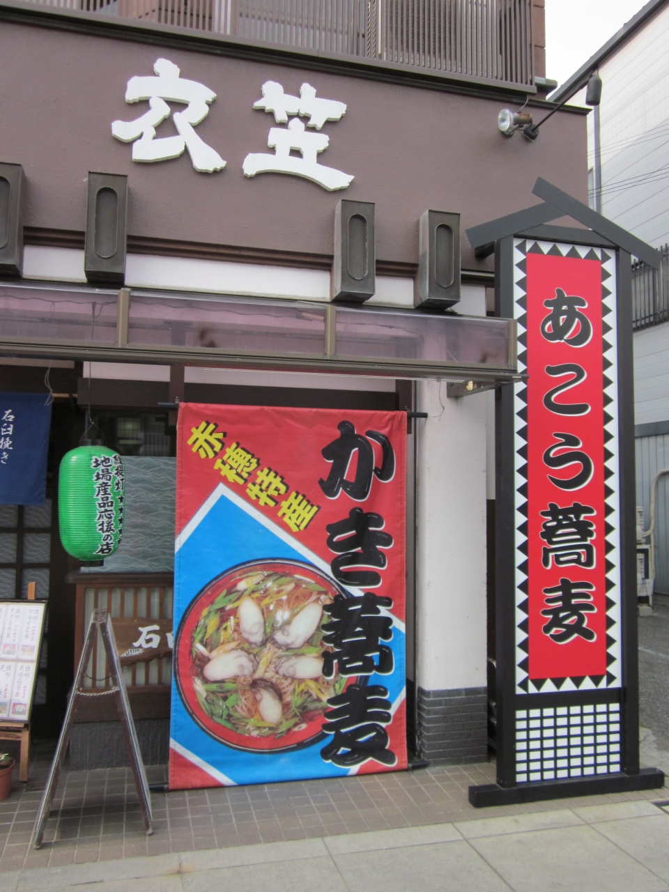 駅前のお城通りを歩いて3分程度~、「あこう蕎麦」と大きな幕が有るので直ぐ解かります。