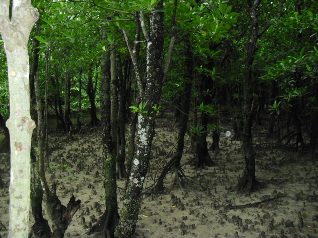 マングローブは、仲間川や浦内川の流域にたくさん生えています。海岸線にもマングローブの群落が広がっているので、ドライブしていて、ロードパークのようなところで休憩すると、そこから遊歩道が伸びていてマングローブの群落を散策できます。