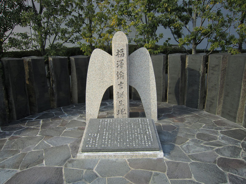 JR・阪神の福島駅、JR東西線新福島駅から徒歩5~10分ほどでアクセスできる、中之島のスポットがほたるまち。ABCテレビもあり、周辺は川に沿って綺麗に整備されています。そのほたるまちの一角、ABCテレビの脇にひっそりとあるのが、福沢諭吉誕生地記念碑。大阪にゆかりのある福沢諭吉の生誕地を示す石碑です。