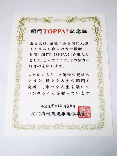 下関と門司を結ぶ関門人道では、門司側、下関側にそれぞれスタンプが設置されています。そのスタンプを両方とも専用台紙(スタンプ台に置かれています)に押せば、門司港またはこの観光案内所にて関門海峡突破記念証が発行されます。