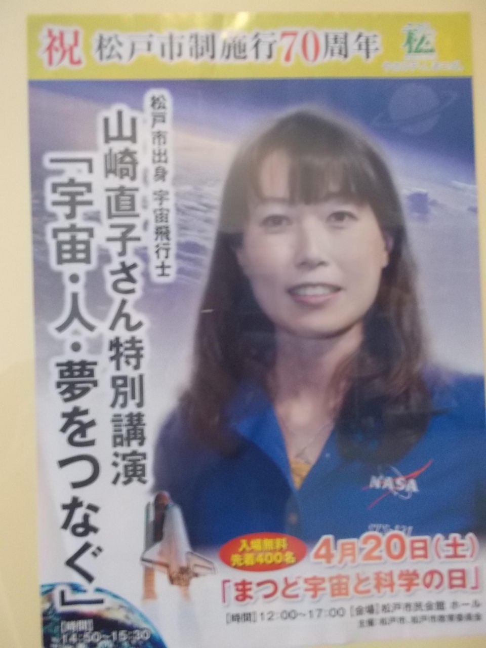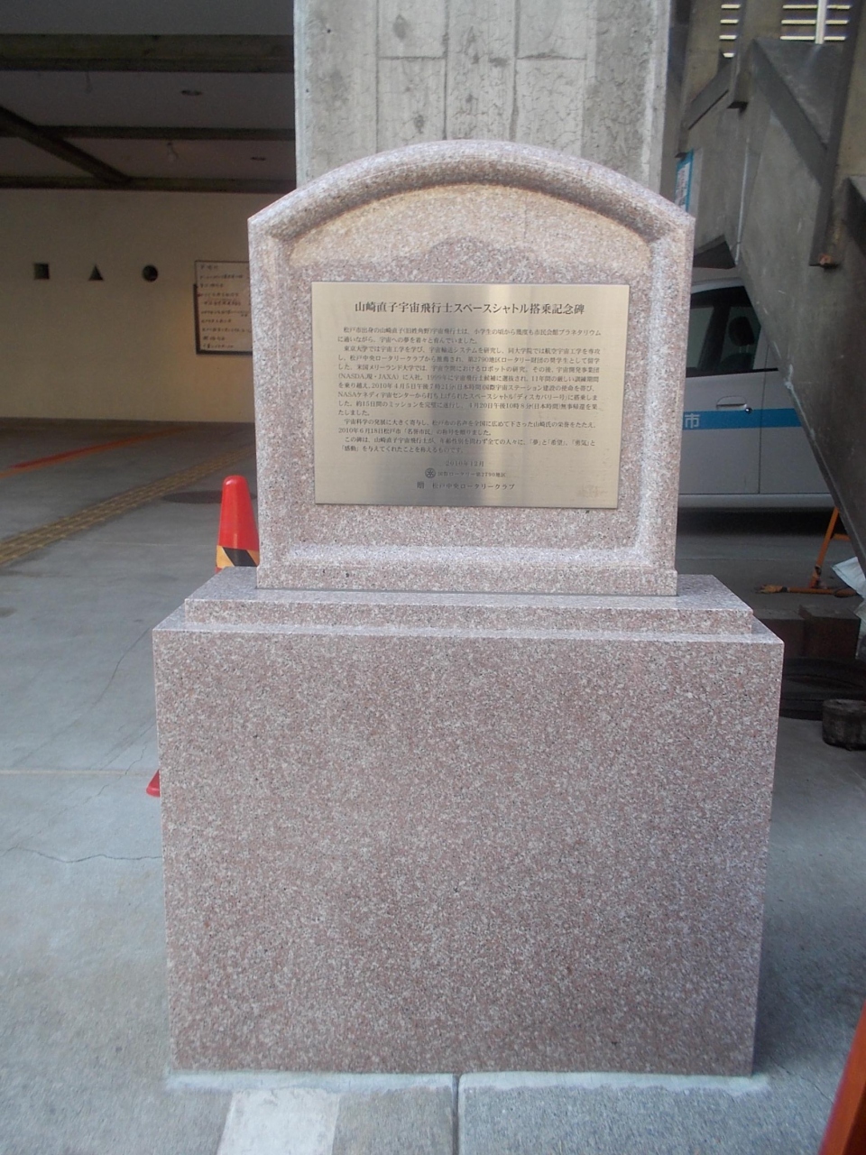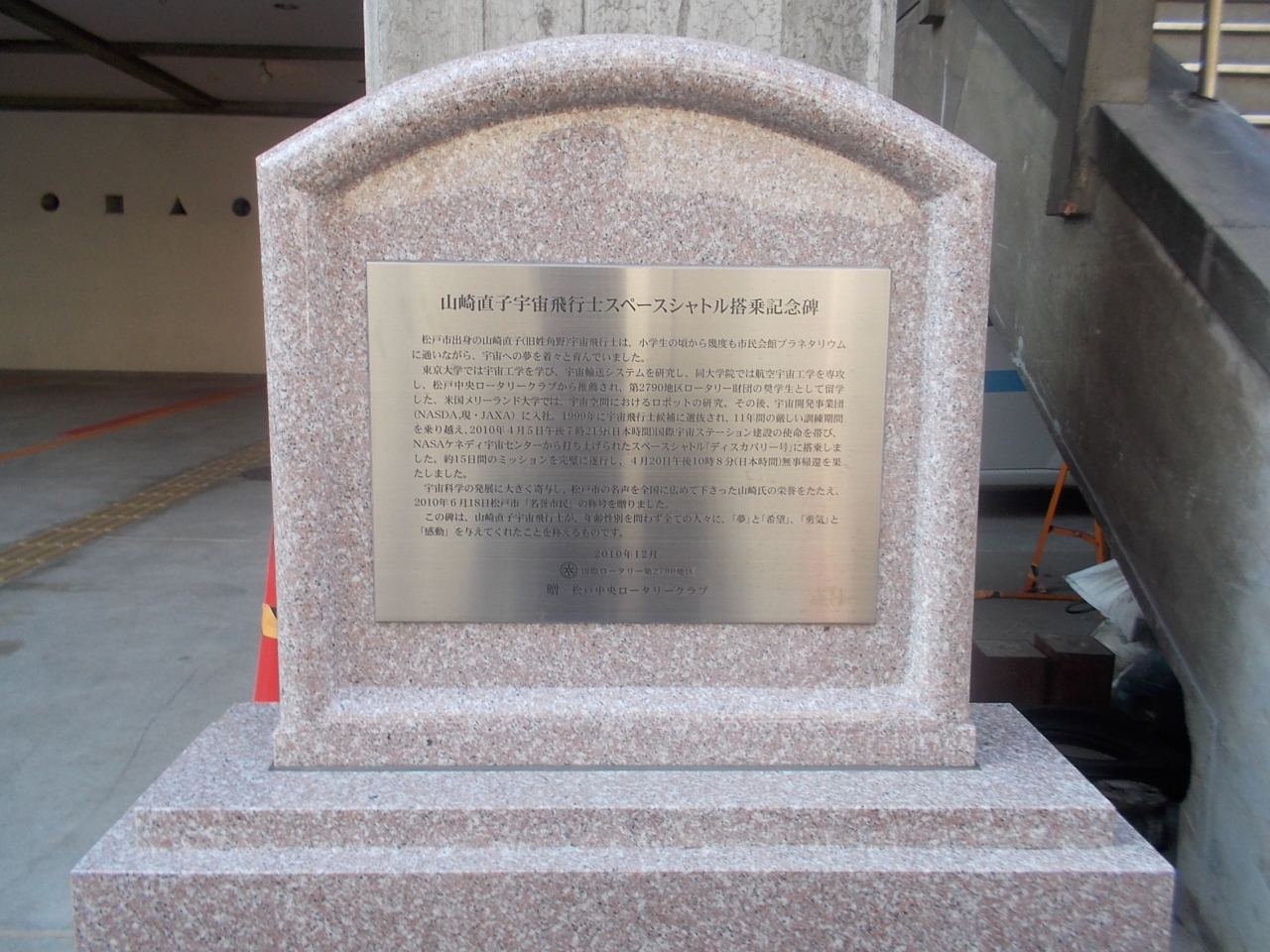 松戸市の市民会館の1階から2階に上がる階段の左側に、山崎 直子さんの「碑」があります。 それほど 大きな「碑」ではないので、あまり目立ちませんが、彼女が相模台小学校に行っていた頃に、この市民会館にあるプラネタリウムに良く行っていたそうです。 その頃の夢がかなって宇宙飛行士になりました。 プらネタリウムの名前も「Naokoプラネタリウム」になっていました。