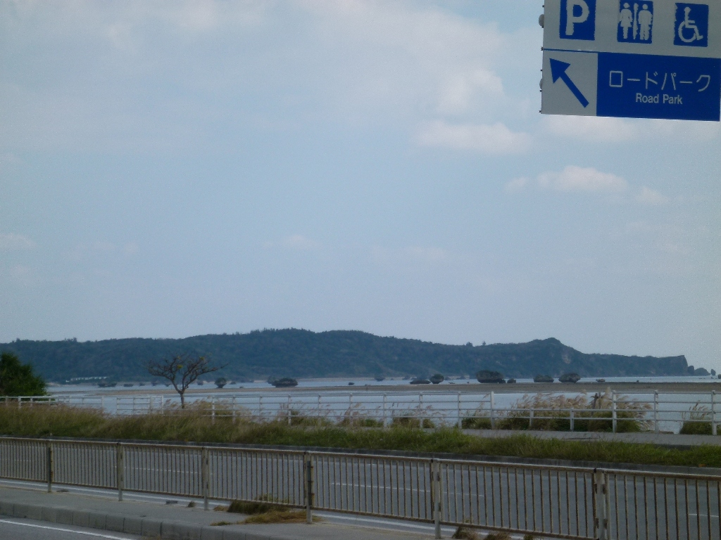 首里城観光をし、海を見たくて郊外へドライブしました。この先の平安座島、浜比嘉島まで続いています。ジョギングしている人、サイクリングしている人、様々な形態でこの南国の青い海、青い空を満喫しています。休憩所もあります。車を止めじーと風にあたり海を見つめていました。いいですね。