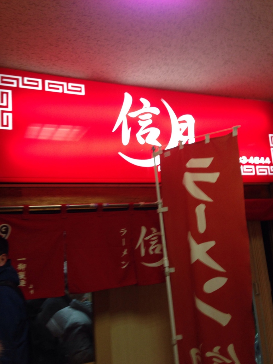 信月はラーメン横丁の隣のビルの入り口にあります。夜の遅い時間でしたが、大勢の方がならんでいました。カウンター席のみの小さな店です。札幌にしては珍しく塩ラーメンが有名。