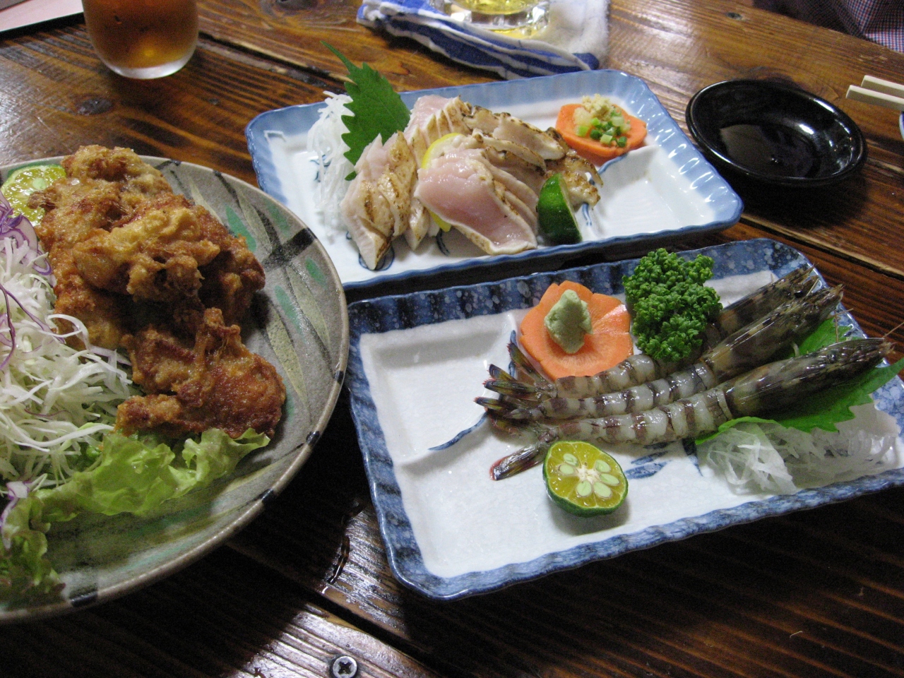 車海老はお刺身と塩焼で。地鶏はたたきとから揚げで頂きました。