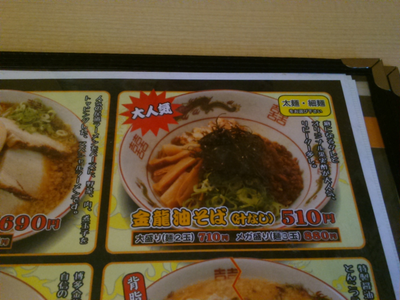 福岡空港の東側、県道68号の志免町役場の横にあります。店内はゆったりとした席の配置で比較的きれい。他店同様に漫画本も結構置いてます。ここのお薦めはやっぱり、金龍油そば。ここ数年で油そばを出すお店が結構増えてますが、ここのがサイコー、もうクセになってて、行く度に注文してます。持ち帰り用も置いてます(480円/2食分)。是非食して見て下さい。