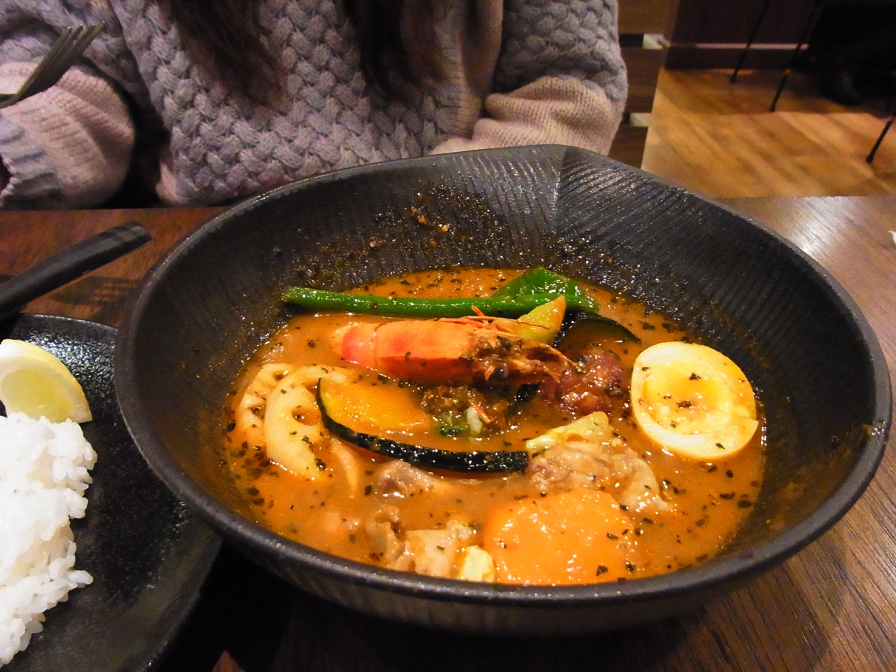 程よくスパイスが香っていてとても美味しかった。辛さもトッピングも選べるので、自分の好みで調整できるのがよい。あまり辛くないもので味を楽しみたかったので、一番辛くないものにした。スープも普通のとエビのがあって選べる。エビのは濃厚さがある。