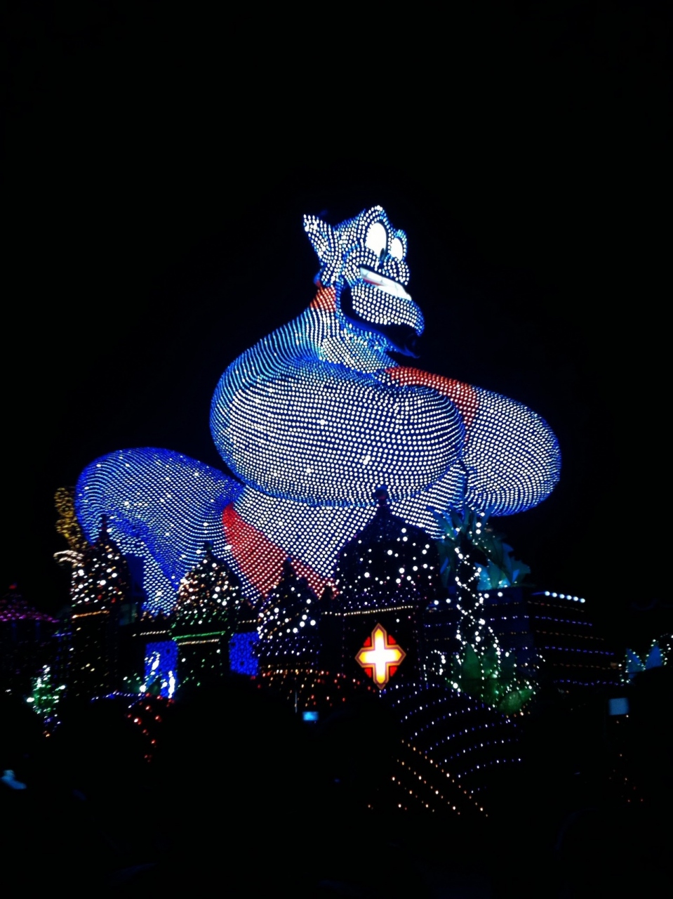 どこから見てもきれいです。停止はしませんが昼のパレードのハピネスイズヒアに比べて進むスピードがゆっくりなので充分楽しめます。