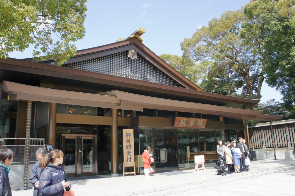 本殿に向かって右の方に真新しい(というほどでもないけど)今風の神楽殿がありました。以前にあった記憶はなく、1994年に竣工した新しいものでした。それほど大きな建物には見えませんが、最大800人が参列できる部屋があるそうです。神楽殿といえば、伊勢神宮をはじめ、かなり立派な建物が残っていますが、空襲にあった明治神宮では再建は遅れたようです。