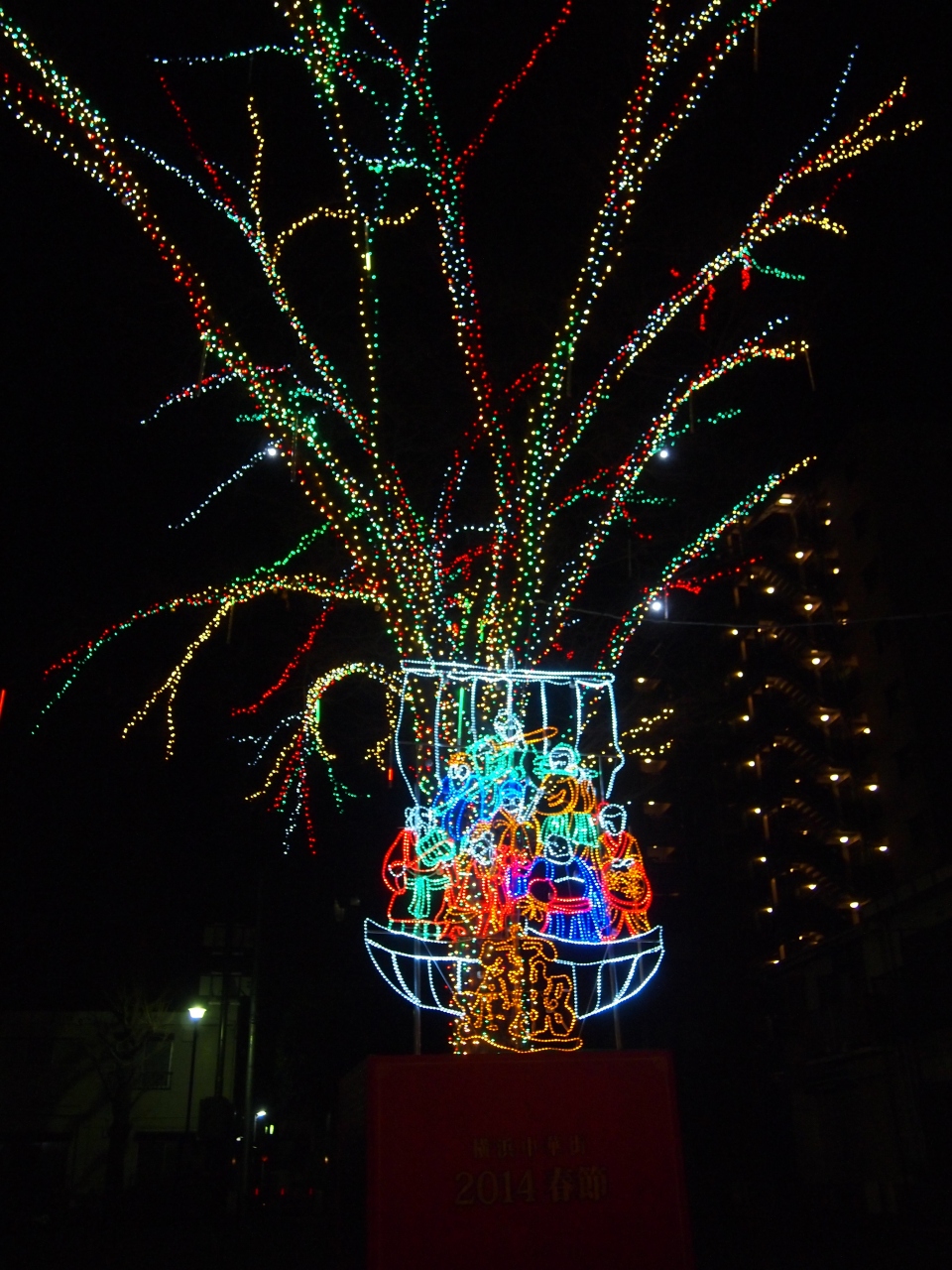中心に大きな木があるのですが、それがちょうど春節の時期だからかド派手なイルミネーションで飾られていて、そのカラーリングや雰囲気に中国らしさを強く感じました。