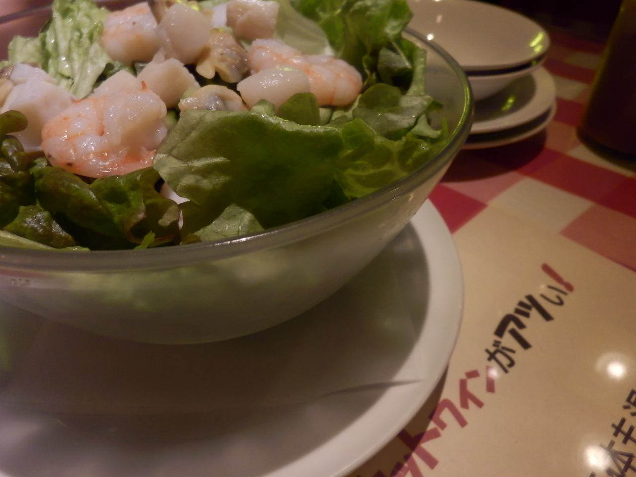 しかし、食べ物のメニューはさほど安くはありません。海鮮のメニューが多いように見えたので、シーフードのサラダ900円を注文してみたら、レタスの上に乗っていたのはなんと冷凍のシーフードミックス。サイゼリアの激安メニューならば納得しますが、900円のメニューでこれは納得できません。他の料理もこれと言って特徴はなし。価格に対して、どれも高く思えました。