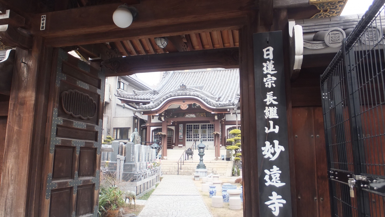 「妙遠寺」は、日蓮宗のお寺で、境内には二ヶ領(稲毛・川崎)用水を完成させた小泉次大夫と川崎中興の祖といわれた田中休愚の偉業を讃える「泉田二君功徳碑」などがあるそうですが、法要で墓参り中に方々に遠慮して、ちょっと気付きませんでした。