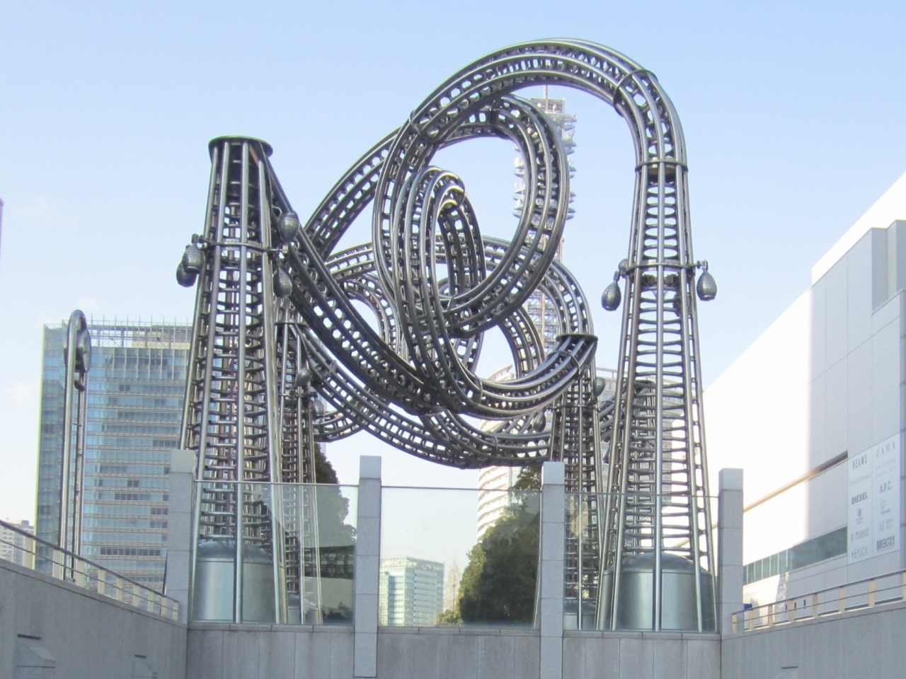 金属製のジェットコースターのような梯子がぐるぐる回っているアート
