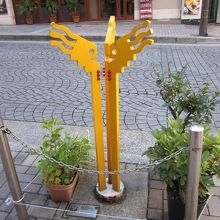 歩道にあるモニュメントで、鮮やかな黄色が目をひきますが、周囲のグリーンにまぎれてお花と間違えてしまうかも。
