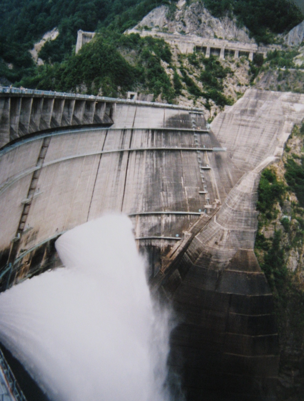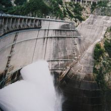 長野県側の扇沢駅からトロリーバスに乗って20分ほどでダムに到着です。高さ186m、堤頂長492m、堤頂幅8.1mととてつもない大きさのダムです。50年も前に良くぞ造ったとただただ感心するばかりの風景です。運よく、放水もしておリ、ごう音とともに黒部川に向けて放水する風景に感動しました。