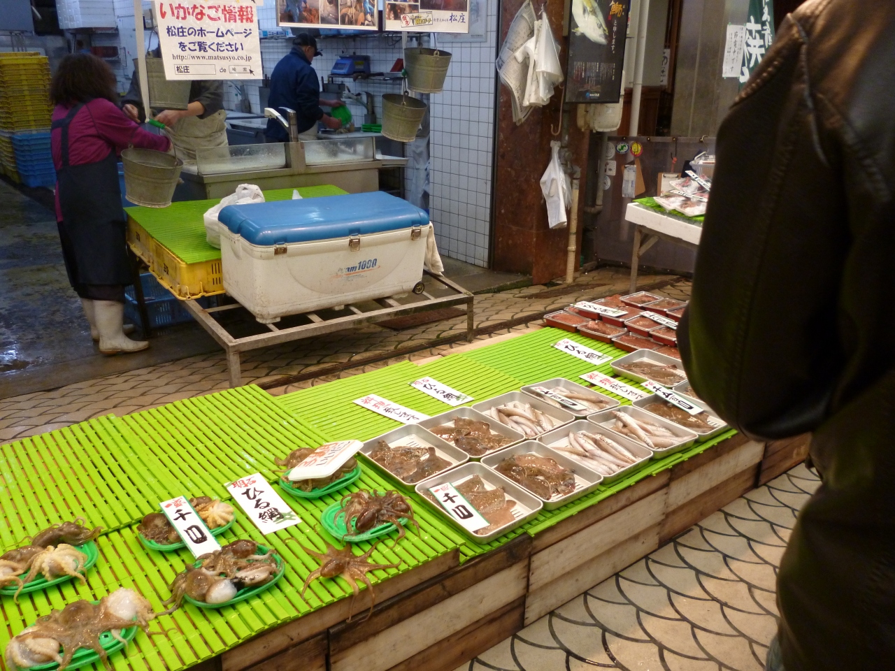 鮮魚屋と明石焼きのお店が圧倒的に多いですがもちろん地元の人も買い物にくる場所だから一通りのお店が並んでいます それでもやはり魚の鮮度と安さは目立っていると思います タコ一匹 魚の切り身一切れでも買えますがトロ箱ごとや鯛やハモ・太刀魚などは一匹まるごと買うと割安です 大家族の方ならお土産替わりにいいんじゃないかと思います
