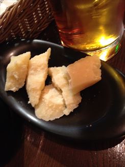 俺のイタリアン YAESUでは、お通しにこのチーズが出てきて、おいしいと思いました、とても固いのですが、濃厚なチーズでお酒にとてもよく、合います。ぜひ、一度、お好きなワインを一緒にお通しを食べながらひと時を楽しんでください。