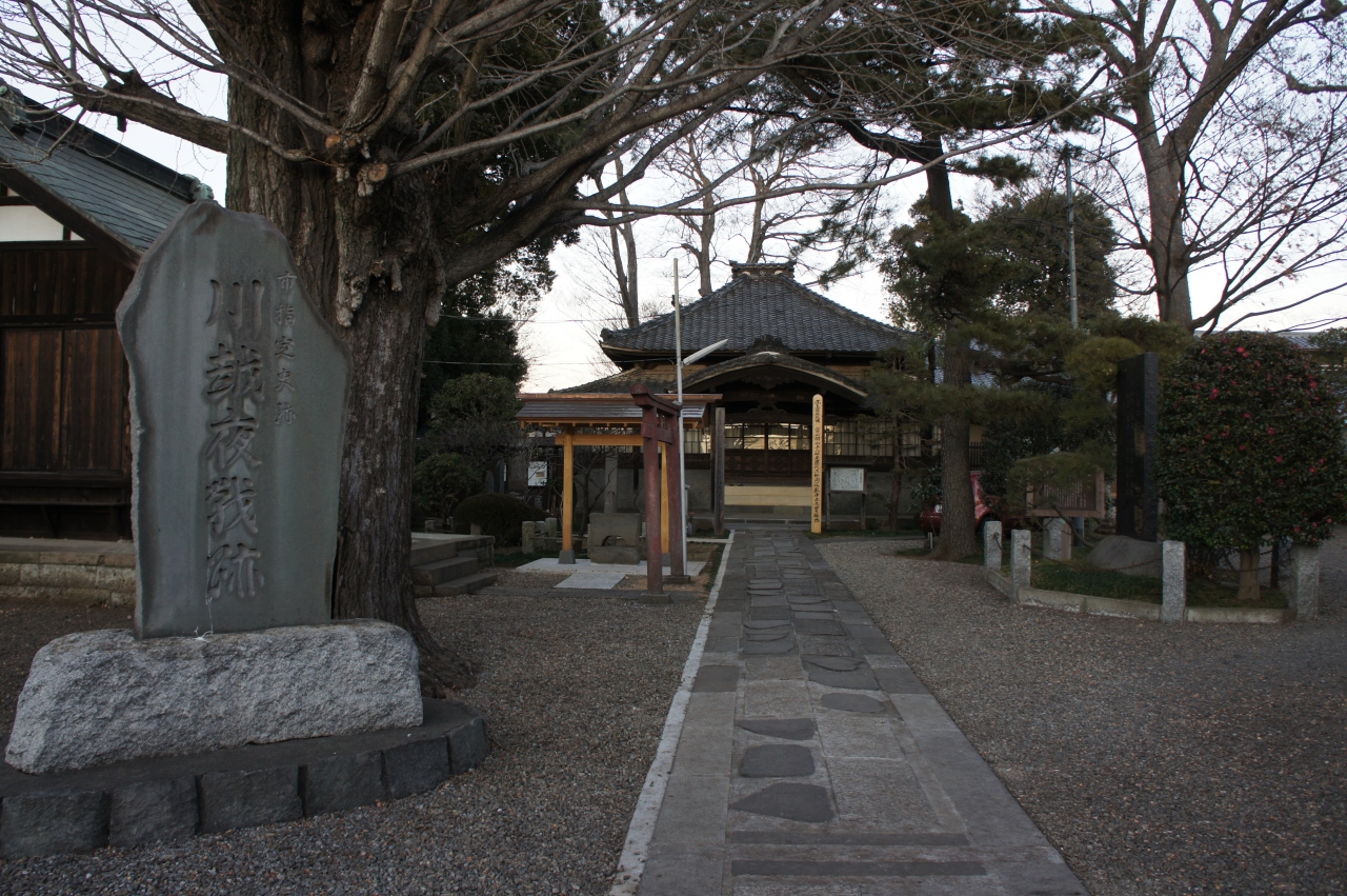 東明寺は、蔵造りの街並みからさらに奥の方に進んだところ。一遍上人が開基したという時宗の古刹です。境内には、河越夜戦の碑。