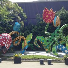 外部にも花のオブジェや、ベンチ・自動販売機まで草間弥生の水玉モチーフが溢れ、街には水玉バスが走ります。